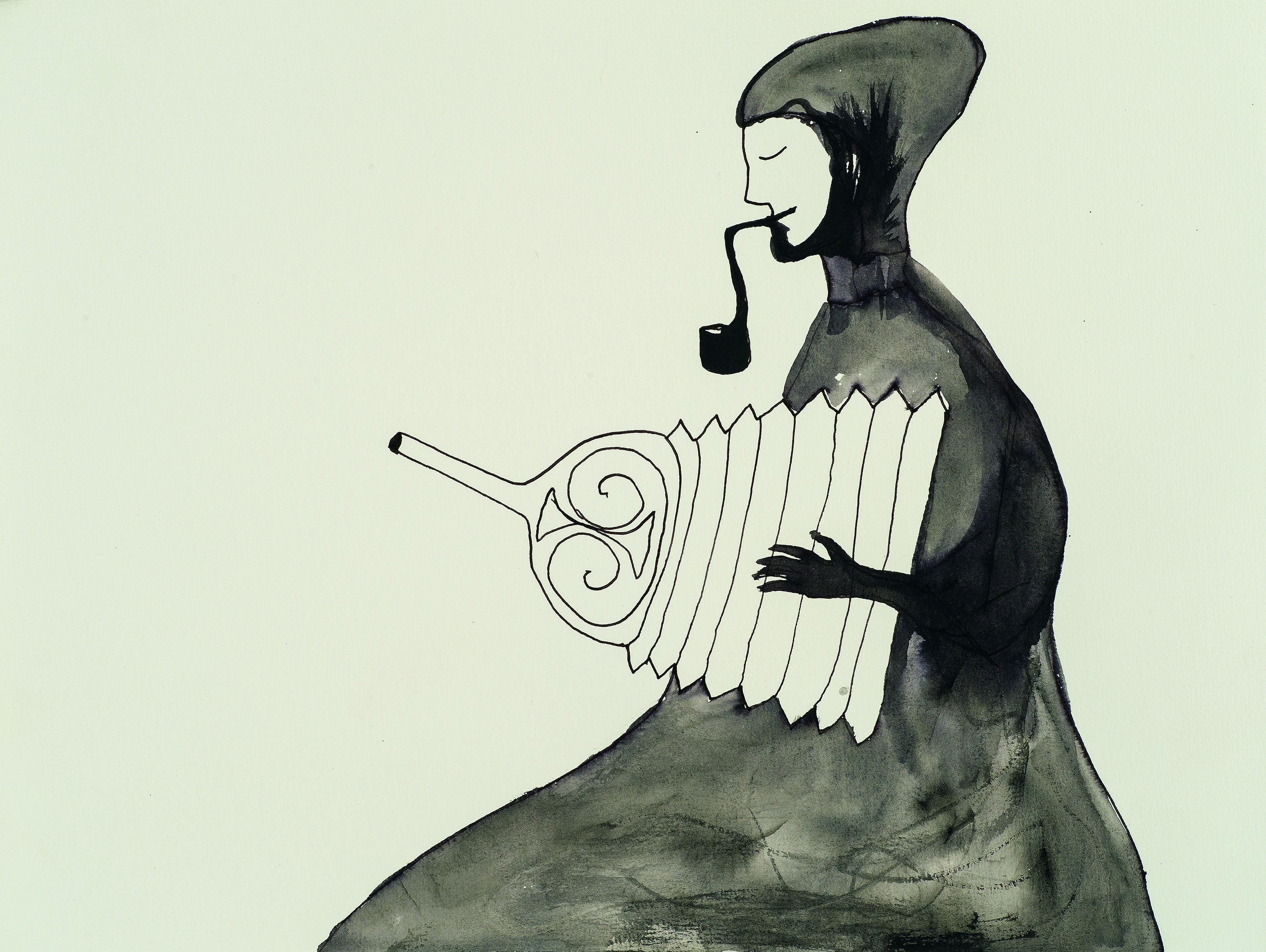 Elle tient à la hauteur de son ventre un grand soufflet qu’elle actionne avec régularité.